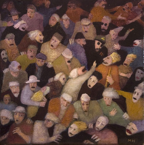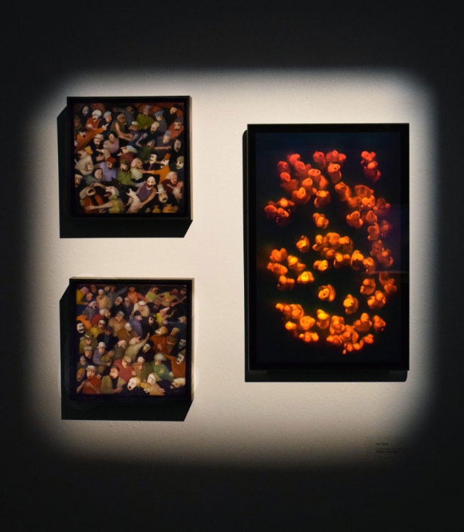 Concept: The idea for the hologram Lost Souls came in 2015 from media images of refugees packed into small boats, fleeing war and mankind's inhumanity. Holographic figures, transient and ephemeral, suggest quiet multicolored bodies - perhaps now beyond fear. Originally the hologram was designed to be placed on the floor and viewers stood over it. In this installation, the hologram was wall-mounted with 2 paintings that depicted the chaos of the 2016 U.S. federal elections. |