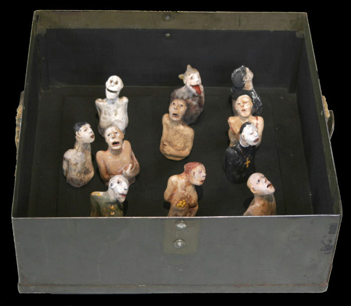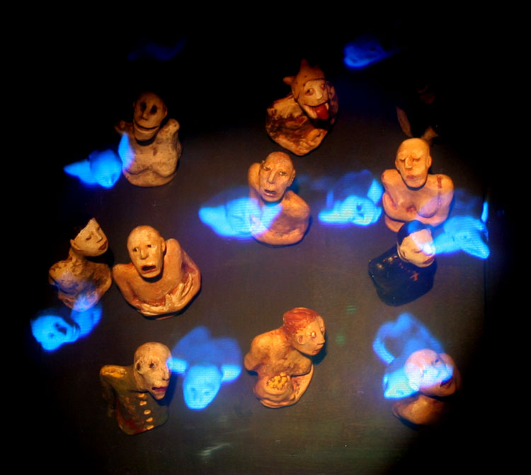 Concept: The ceramic figures, created in 2016, represented political figures of that era - archetypes and personifications such as Greed or The Fool, all in the spirit of Commedia dell'arte. Blue holographic counterparts hovering over the actual figures can be seen as spirits, souls, or rarely, a fleeting moral consciousness. The Greek poet Hesiod defined them best for his times and his interpretation still resonates today: "For upon the bounteous earth Zeus has thrice ten thousand Spirits, watchers of mortal men, and these keep watch on judgments and deeds of wrong as they roam, clothed in mist, all over the earth." -Hesiod Works and Days (c. 700 B.C.) |